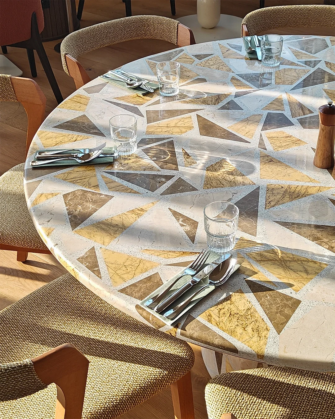 We work with terrazzo as a living material, adapting forms to its qualities rather than forcing it.